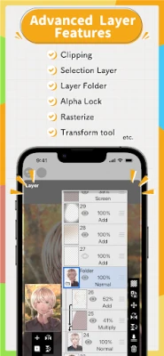 - Various layer commands such as layer duplication, import from the photo library, horizontal inversion, vertical inversion, layer rotation, layer moving, and zooming in/out.
