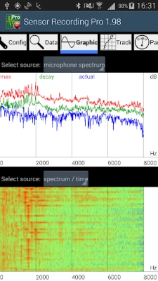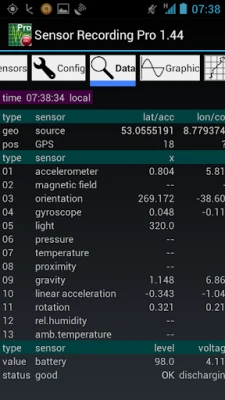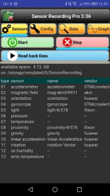 Furthermore, it can read out all the measurement values, display them in table form or graphics and store them as an ASCII file (csv = comma-separated values) for possible further evaluation, e.g. in a spread sheet like MS Excel. That is the main focus of this app, as its name indicates. Moreover, position data are recorded in a kml file for direct display with a program such as Google Earth. All related files are located in the sub-directory "SensorRecording".